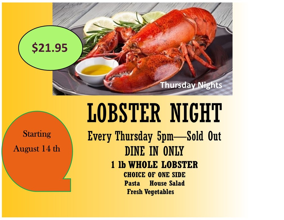 Starting Aug 14th Lobster night Every Thursday Night $21.95
